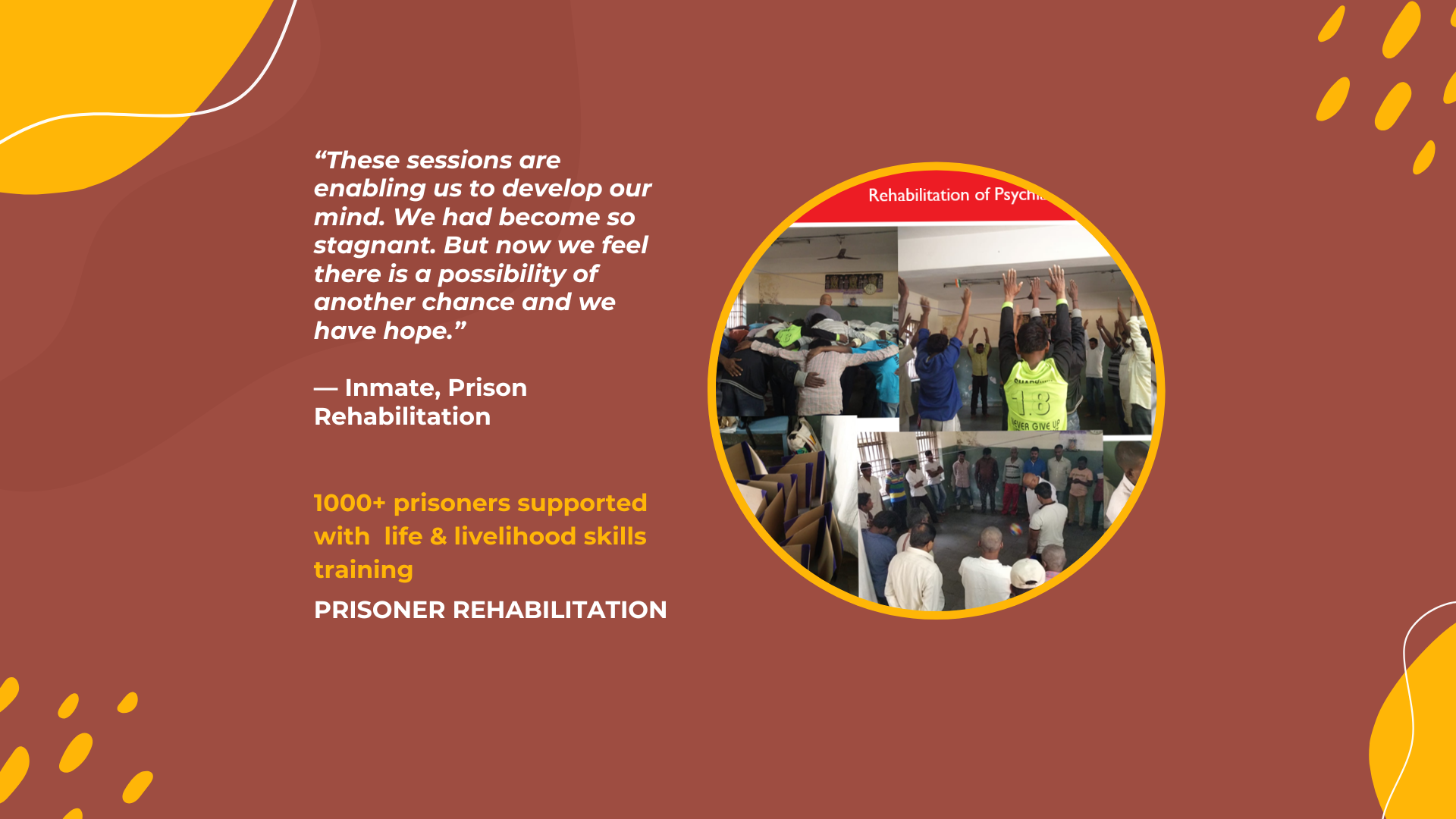 ” These sessions are enabling us to develop our mind. We had become stagnant. Now we feel there another chance and we have hope.”