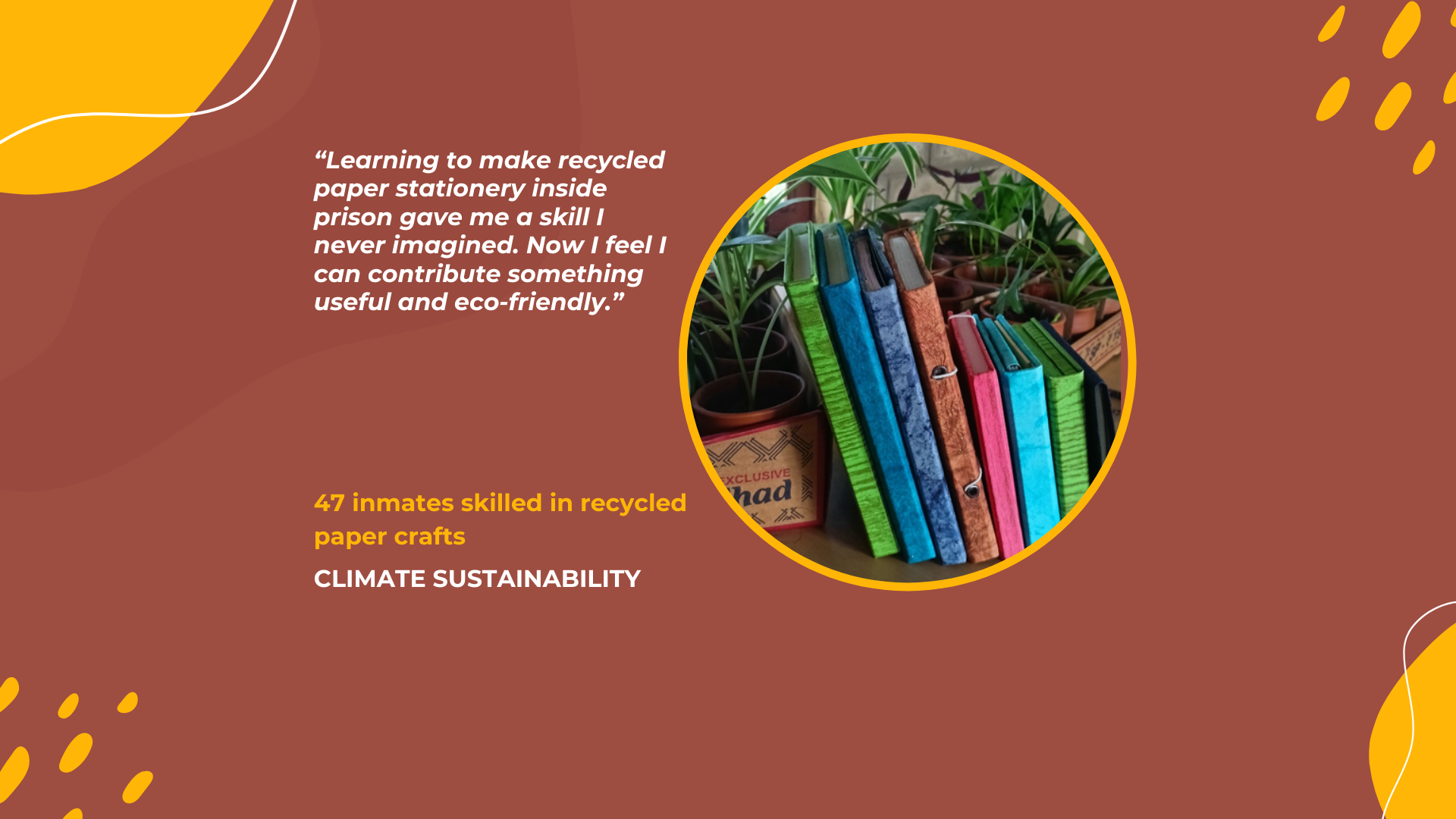 Climate sustainability has emerged as an expanding area of work. This expansion grows organically from our rehabilitation programs, where recycled paper crafts and stationery training have long been part of vocational skills development. From correctional facilities to classrooms, our work reflects a simple conviction: peace is sustained when both people and the planet are cared for.